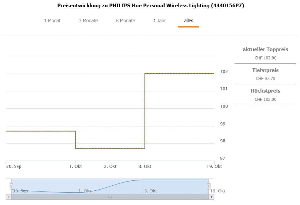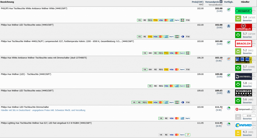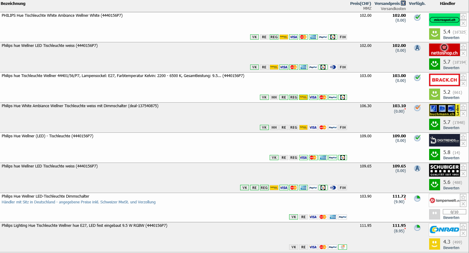 Gemäss toppreise gab es das Licht bislang nie günstiger als für 97.70 CHF, der zweitbeste Preis liegt aktuell bei 102.- CHF.