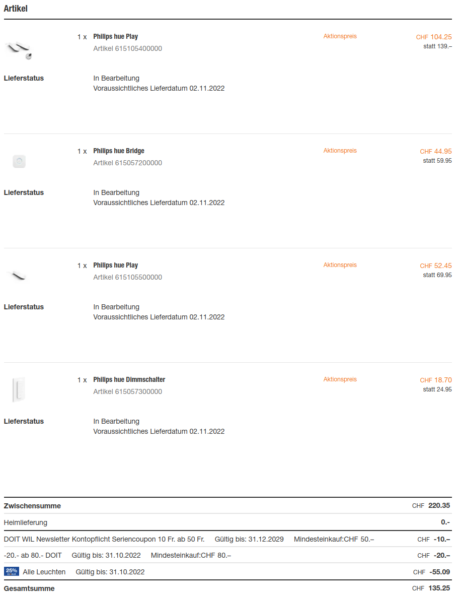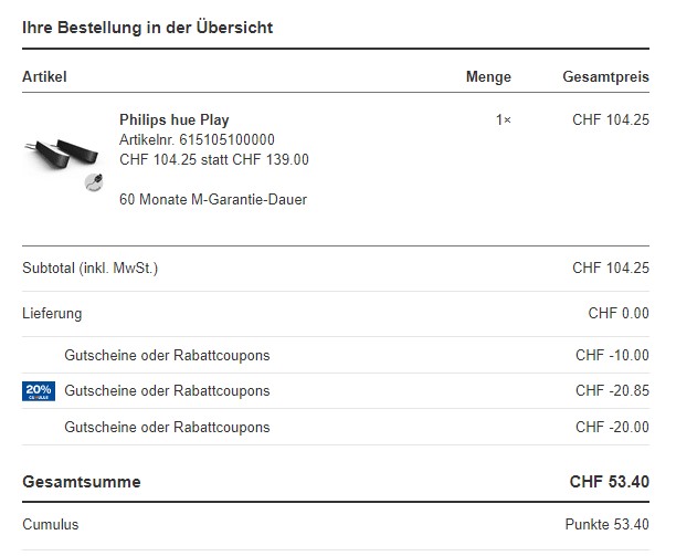 So bekommt man z.B. das Philips Hue Play Bar 2er Set in schwarz oder weiss für CHF 74.25 resp. CHF 53.40.