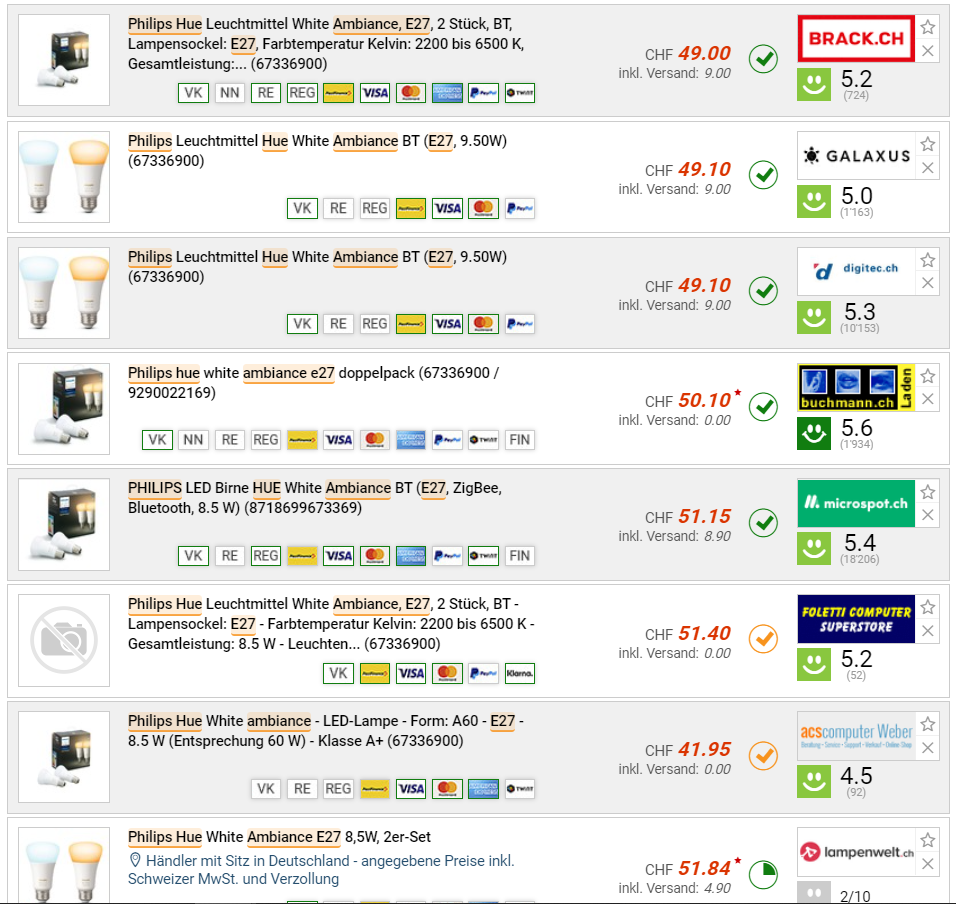 Bei Amazon Grossbritannien gibts derzeit ein starkes Angebot zum Doppelpack der beliebten Philips Hue Glühbirnen. So gibts die White Ambiance E27-Leuchtmittel im Doppelpack inkl. Versand für günstige 31 Franken, in der Schweiz starten die Preise derzeit ab 50 Franken.