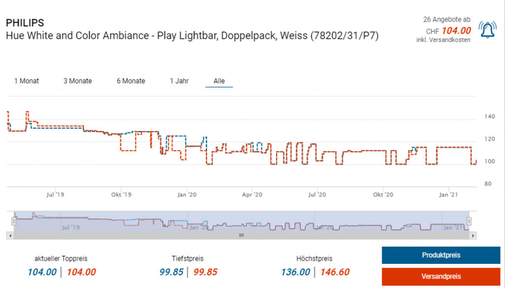 Bei microspot und Amazon gibts zurzeit die Leuchtmittel White And Color Ambiance Play Lightbar von Philips Hue im Doppelpack für CHF 94.- resp. CHF 95.-