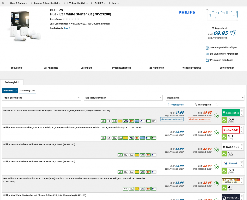 Das Philips HUE White Starter Kit gibt’s mal wieder für einen guten Preis bei Microspot. Für knapp CHF 70.- ist das ein gutes Angebot. Zweitbester Preis ist CHF 89.-. Gemäss Toppreise gab’s dieses Angebot im Januar mal für CHF 68.-.