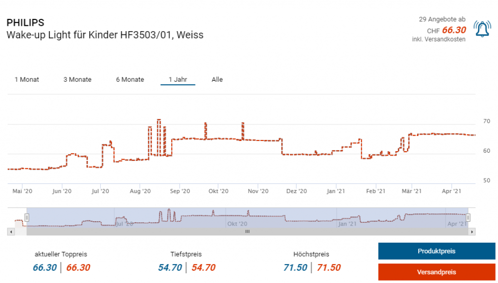 Im Philips Shop gibts derzeit das Wakeup-Light HF3503/01 zum Aktionspreis von 72 Franken. Wenn ihr euch noch zum Newsletter anmeldet, erhaltet ihr einen 20% Rabatt Gutschein. Mit diesem drückt ihr den Preis hier im Deal dann in die Nähe des Bestpreisniveaus auf CHF 57.60. Ansonsten soll der Vergleichspreis bei CHF 66.30 liegen.