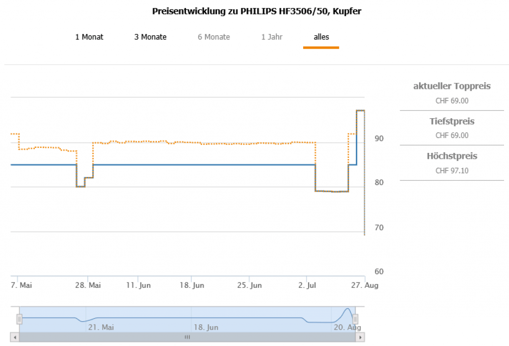 Gemäss toppreise gab es den Wecker bislang nie günstiger als für 78.85 CHF, der zweitbeste Preis liegt aktuell bei 91.85 CHF.