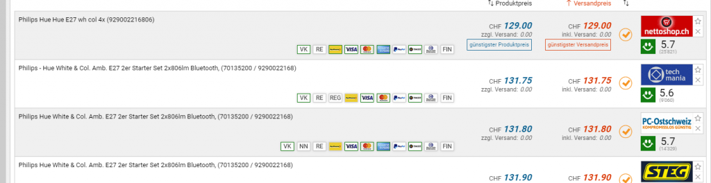 Bei Amazon.it gibt es das Philips Lighting White and Color Ambiance Starter Kit für CHF 77.- anstatt CHF 109.-. Der zweitbeste Preis beträgt in der Schweiz CHF 129.-.
