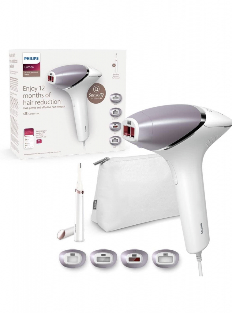 Im Lieferumfang enthalten: 1x Philips Lumea IPL Haarentfernungsgerät 8000 Series (BRI949/00), 1x Satin Compact Korrekturtrimmer, 4x Aufsätze für Körper, Gesicht, Bikinizone und Achselhöhlen, 1x Aufbewahrungstasche