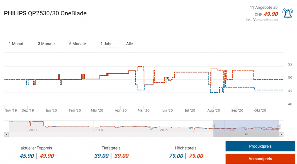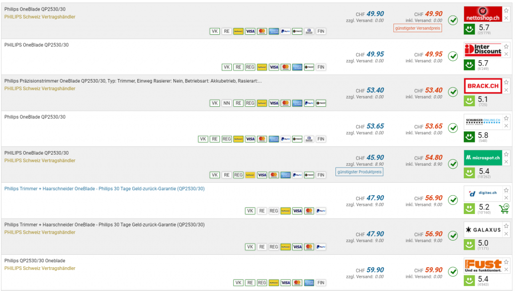 Bei Amazon.fr gibt’s den Philips OneBlade Face QP2530/30 wieder mal günstig. Inklusive Lieferung bei Bestellung von einem Stück: CHF 30.- Bei Bestellung von zwei Stück entfallen die Versandkosten, man bezahlt dann 48 Franken, also 24 Franken pro Stück.