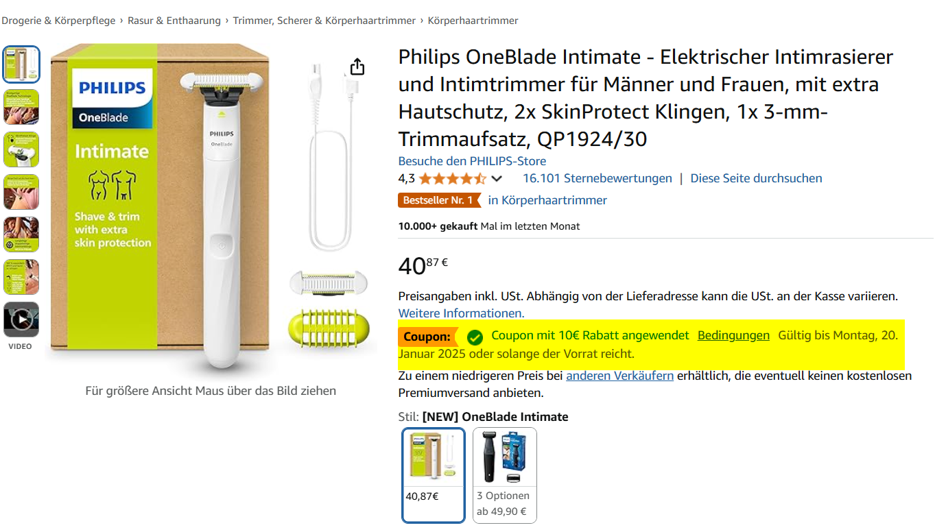 Aktuell bietet Amazon den Philips OneBlade Intimate mit extra Hautschutz und 2x SkinProtect-Klingen für den Preis von 35.60 Franken inklusive Lieferung an. Damit ihr auf diesen Preis kommt, müsst ihr den Coupon aktivieren, der eine Vergünstigung von 10 EUR gewährt. Der Coupon gilt, solange Vorrat, bis und mit dem 20.1. Der Vergleichspreis liegt aktuell bei 45.90 Franken.