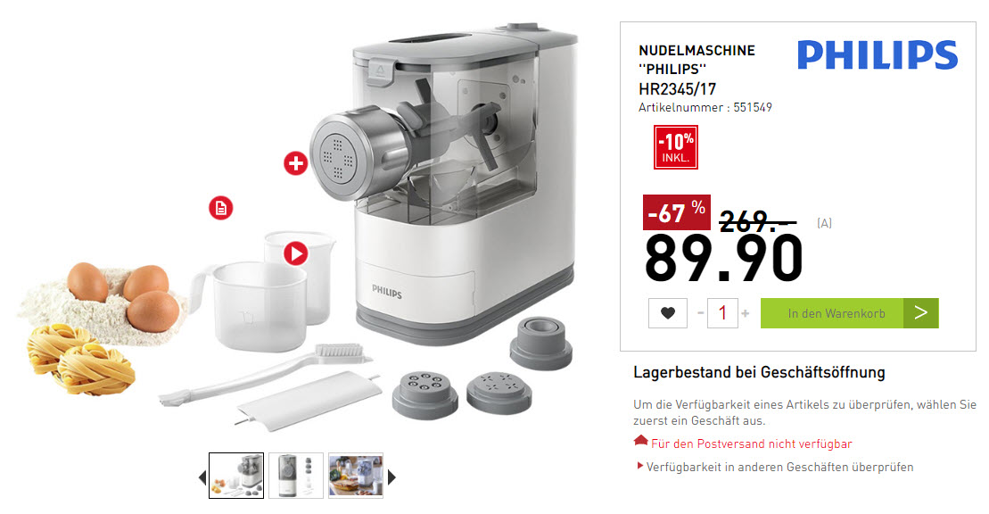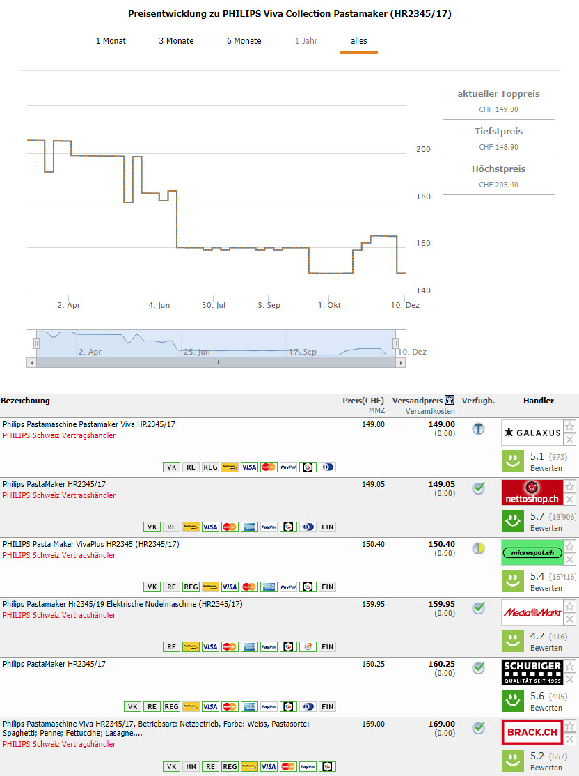 Momentan gibt es den Philips Pastamaker HR2345/17 zu einem wirklich sehr attraktiven Preis von CHF 89.90, welcher laut Toppreise auch der aktuelle Bestpreis ist.
