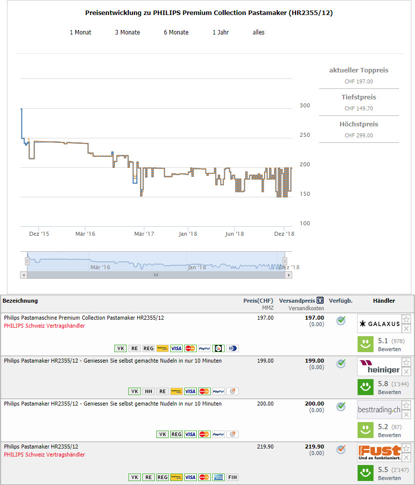 Akutell gibt es im Sale von Nettoshop den Philips PastaMaker HR2355/12 für CHF 149.90 wenn man beim Checkout den CHF 10.- Gutscheincode CHRISTMAS-WIN-18 verwendet. Bestellt man gleich noch die Keks-Formscheibe und die Pasta-Formscheibe dazu (oder andere Artikel, damit der ein totaler Warenwert von CHF 200.- erreicht wird) so kann man sogar den CHF 20.- Gutscheincode WIN1812-20 beim Checkout anwenden.