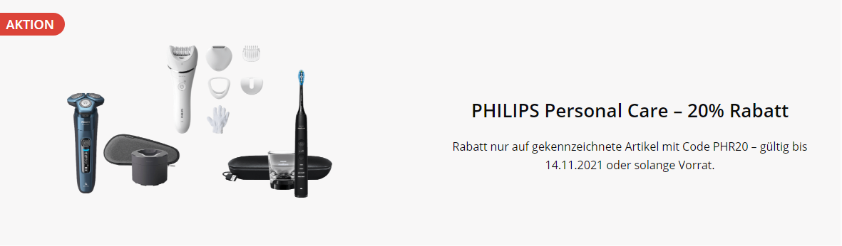 20% Rabatt auf viele PHILIPS Personal Care Produkte bei microspot mit dem Code: PHR20 . Gültig bis 14.11.2021 oder solange Vorrat.