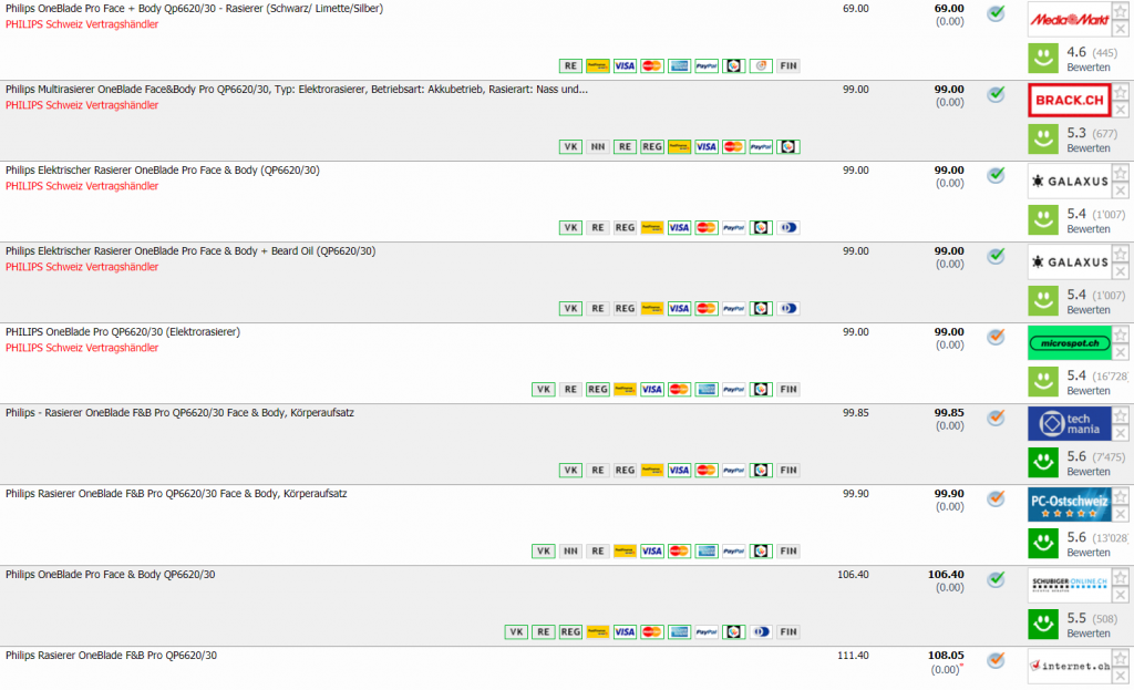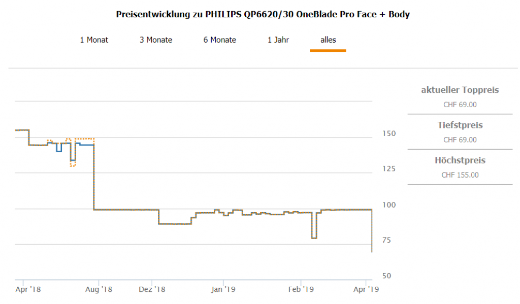 Im Tagesdeal bei MediaMarkt gibt’s heute den PHILIPS QP6620/30 OneBlade Pro Face + Body für CHF 69.- Zweitbester Preis im Moment liegt bei CHF 99.- Bestpreis war bei CHF 79.-