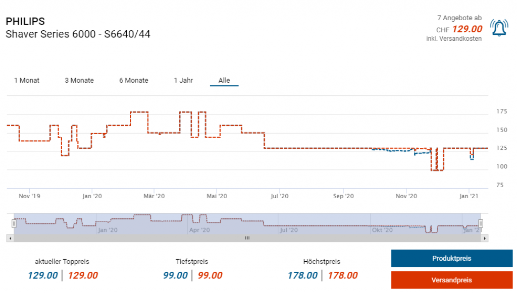 Bei Amazon Frankreich gibts derzeit den Rasierer S6640/44 von Philips zum Aktionspreis von knapp 87 Franken. Laut toppreise starten die Preise in der Schweiz bei 129 Franken für dieses Modell, der bisherige Bestpreis soll bei 99 Franken gelegen haben.