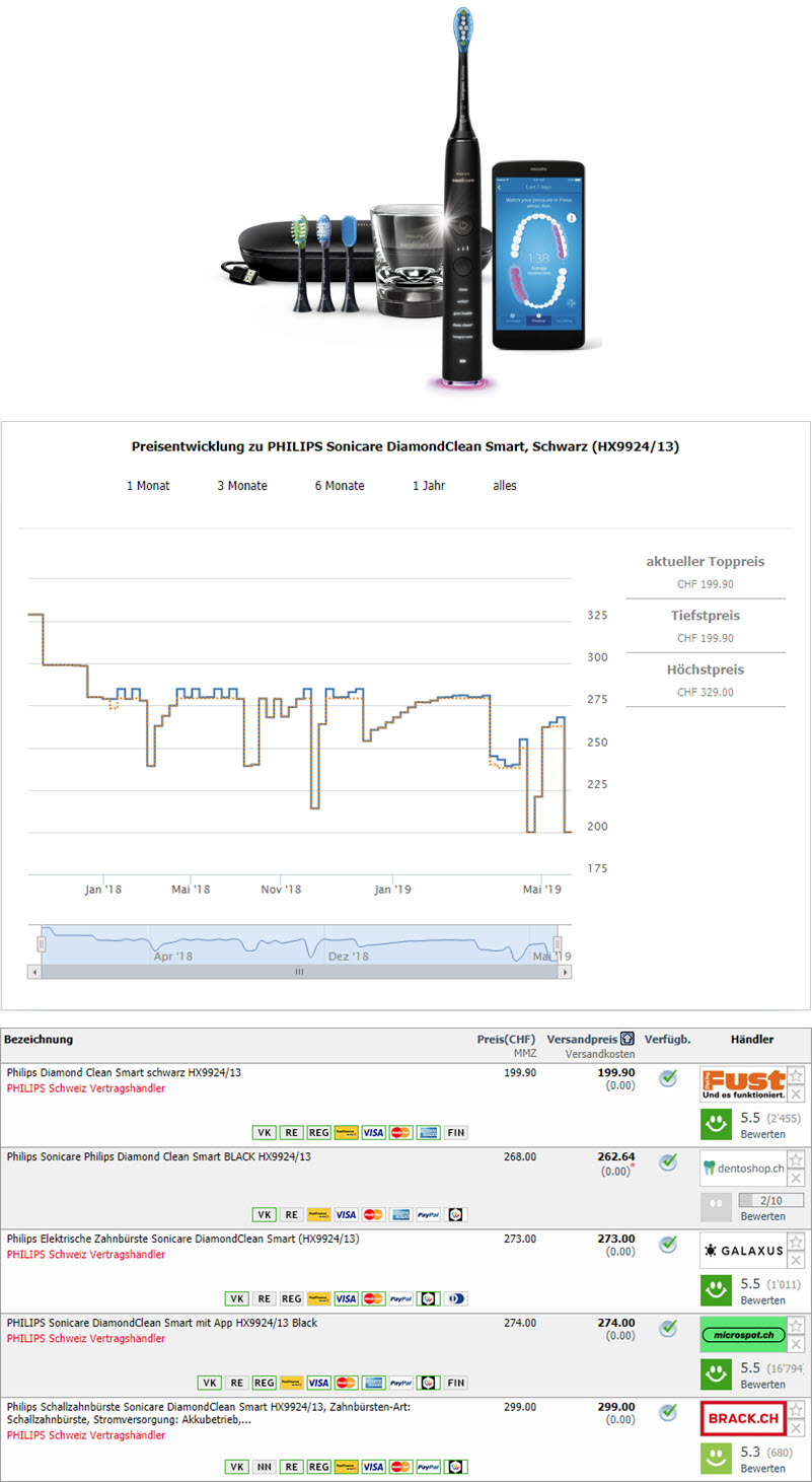 Bei FUST gibt es momentan die Philips Schallzahnbürste Sonicare DiamondClean Smart HX9924/13 zum Bestpreis von CHF 179.90 wenn man beim Checkout den CHF 20.- Rabattcode 1119RM verwendet.