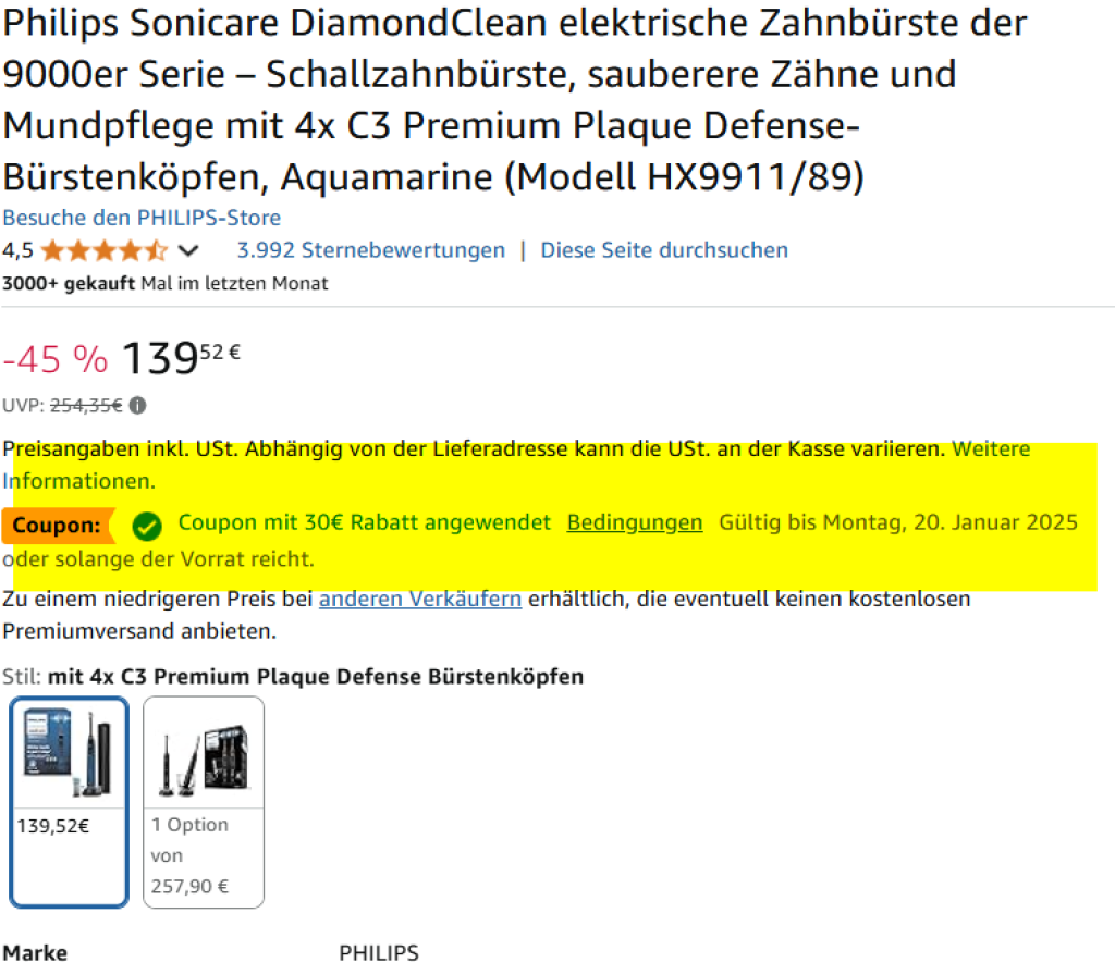 Bei Amazon gibt es aktuell die Philips Sonicare DiamondClean 9000 + 4x C3 Bürstenköpfe für umgerechnet 102.95 Franken inklusive Lieferung mit der Aktivierung des Coupons. Beim nächstgünstigsten Anbieter wird dafür ein Preis von 173.– Franken verlangt.