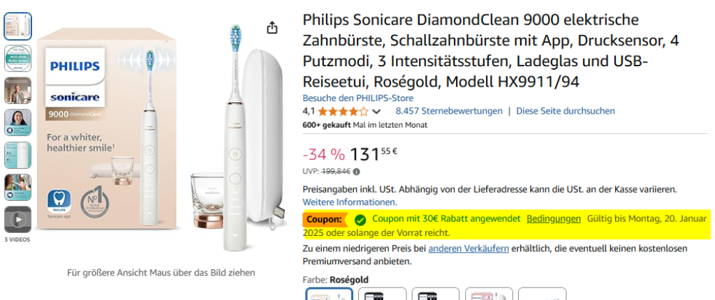 Die Philips Sonicare DiamondClean 9000 gibt es inklusive Ladeglas und USB Reiseladeetui bei Amazon für umgerechnet 102.- Franken. Um auf diesen Preis zu kommen, müsst ihr einfach den 30 EUR Coupon aktivieren. Der Coupon ist bis und mit dem 20.1. gültig, solange Vorrat. Der nächstgünstigste Anbieter verlangt aktuell 145.- Franken.