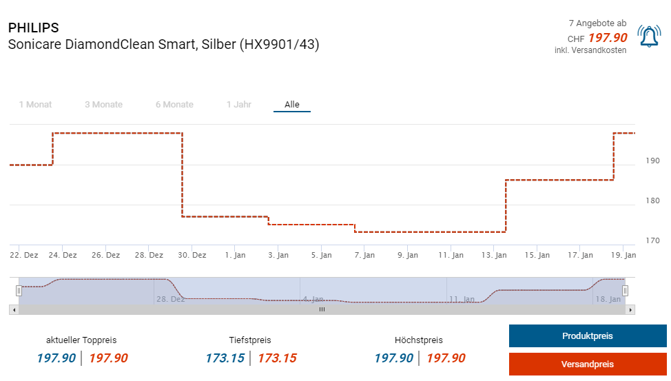 Bei nettoshop gibts derzeit die elektrische Zahnbürste Philips Sonicare Diamondclean Smart HX9901/43 zum Aktionspreis von 189 Franken. Mit dem bekannten 15 Franken Code drückt ihr den Preis nochmal etwas nach unten. Laut toppreise läge der Vergleichspreis für dieses Modell bei knapp 198 Franken.