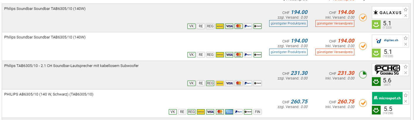 Bei Galaxus gibt es die Philips Soundbar TAB6305/10 für den neuen Bestpreis von CHF 194.-. Der vorherige Bestpreis CHF 215.-. Der zweitbeste Preis beträgt CHF 231.30.