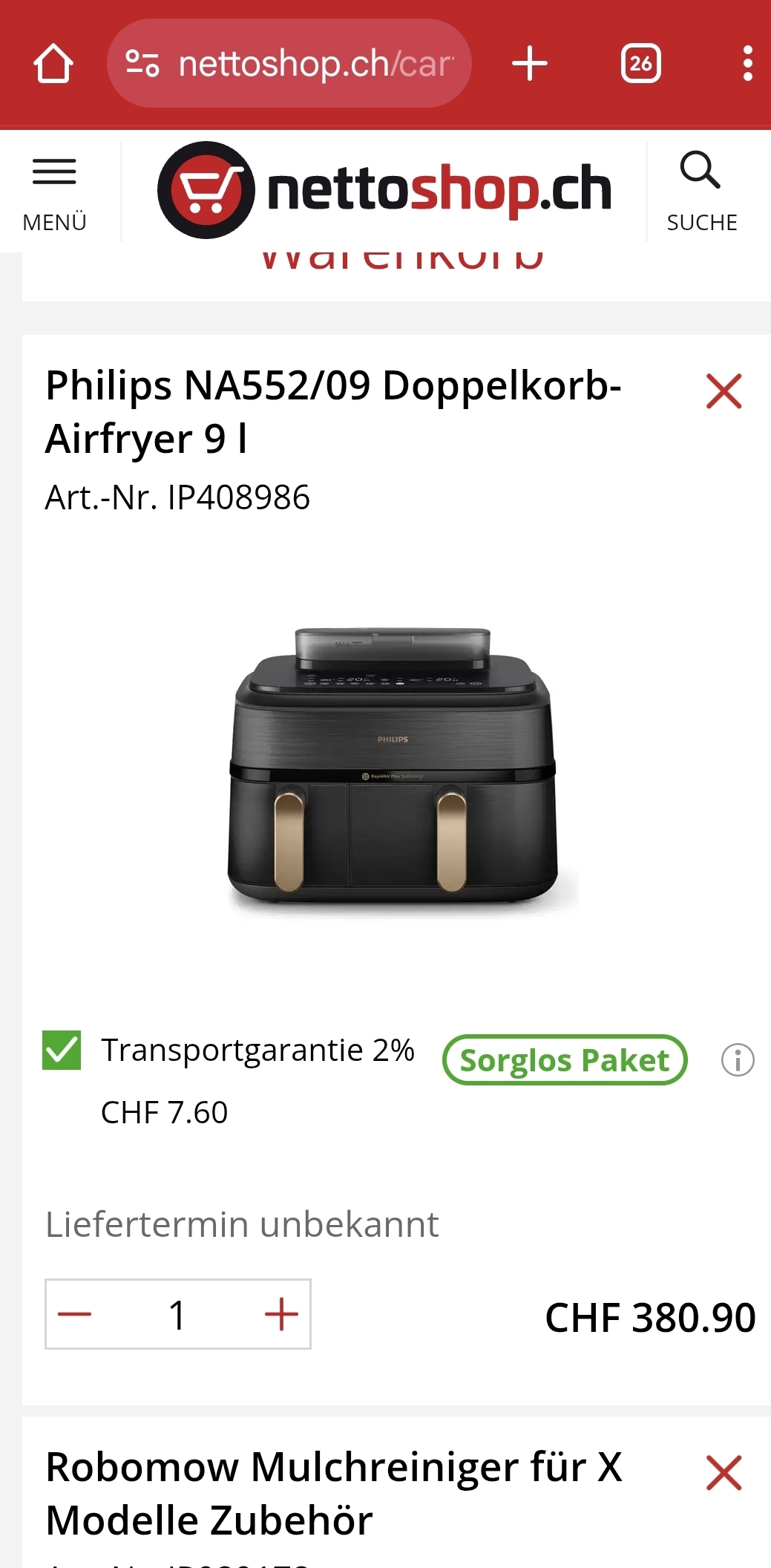 Derzeit gibt es bei Nettoshop die Philips Steam Airfryer 5000 Series Dual Basket mit Dampfgar-Funktion mit dem Füllartikel zum Preis von 180.65 Franken. Den Füllartikel müsst ihr nehmen, damit ihr den Rabattcode anwenden könnt. Der aktuell nächstgünstige Anbieter liegt bei 269.- Franken für die CH-Version.