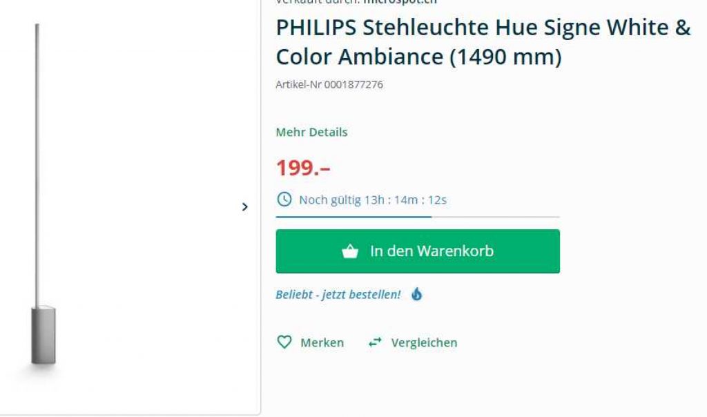 Bei Microspot gibt es die PHILIPS Stehleuchte Hue Signe White & Color Ambiance für den Bestpreis von CHF 189.- (Code: TRADINGMSP-2019). Leider ist keine Preiskurve vorhanden, jedoch beträgt der zweitbeste Preis CHF 250.10.