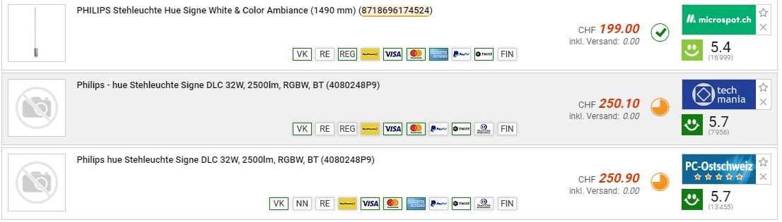 Bei Microspot gibt es die PHILIPS Stehleuchte Hue Signe White & Color Ambiance für den Bestpreis von CHF 189.- (Code: TRADINGMSP-2019). Leider ist keine Preiskurve vorhanden, jedoch beträgt der zweitbeste Preis CHF 250.10.