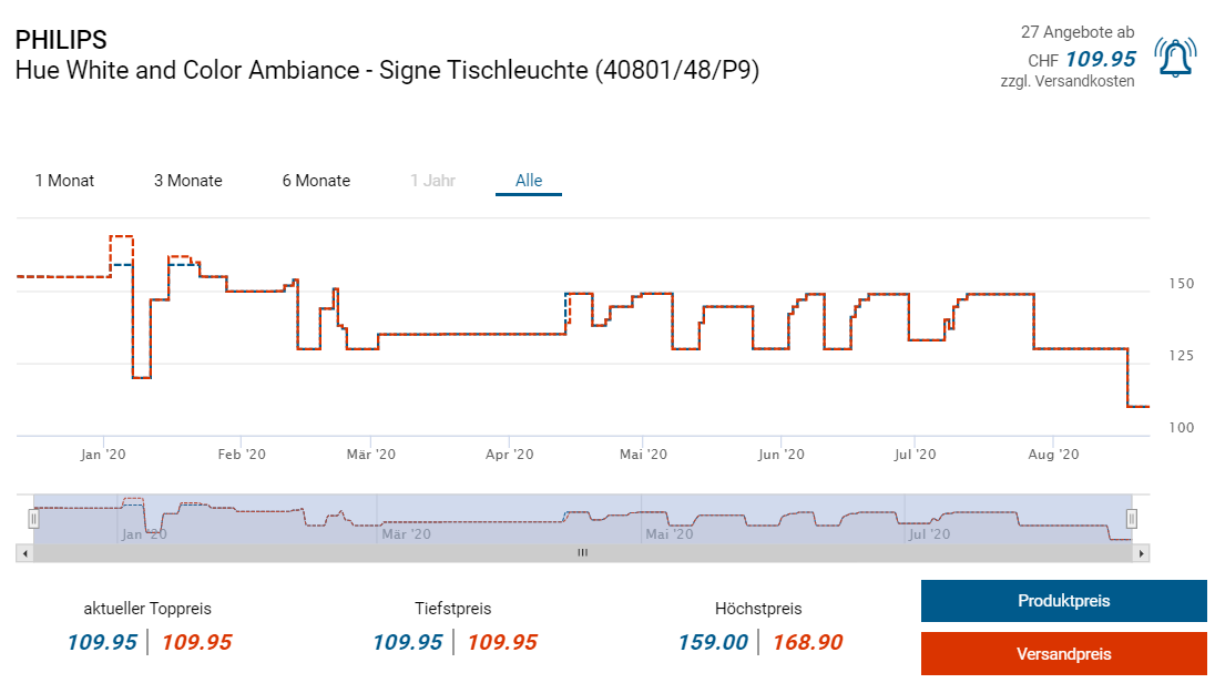 Bei microspot gibts noch wenig Stück der Tischleuchte Philips Hue Signe white & Color Ambiance zum neuen Bestpreis von knapp 110 Franken. Der zweitbeste Preis liegt derzeit bei 135 Franken, günstiger als für CHF 119.90 soll es die Leuchte nie gegeben haben.