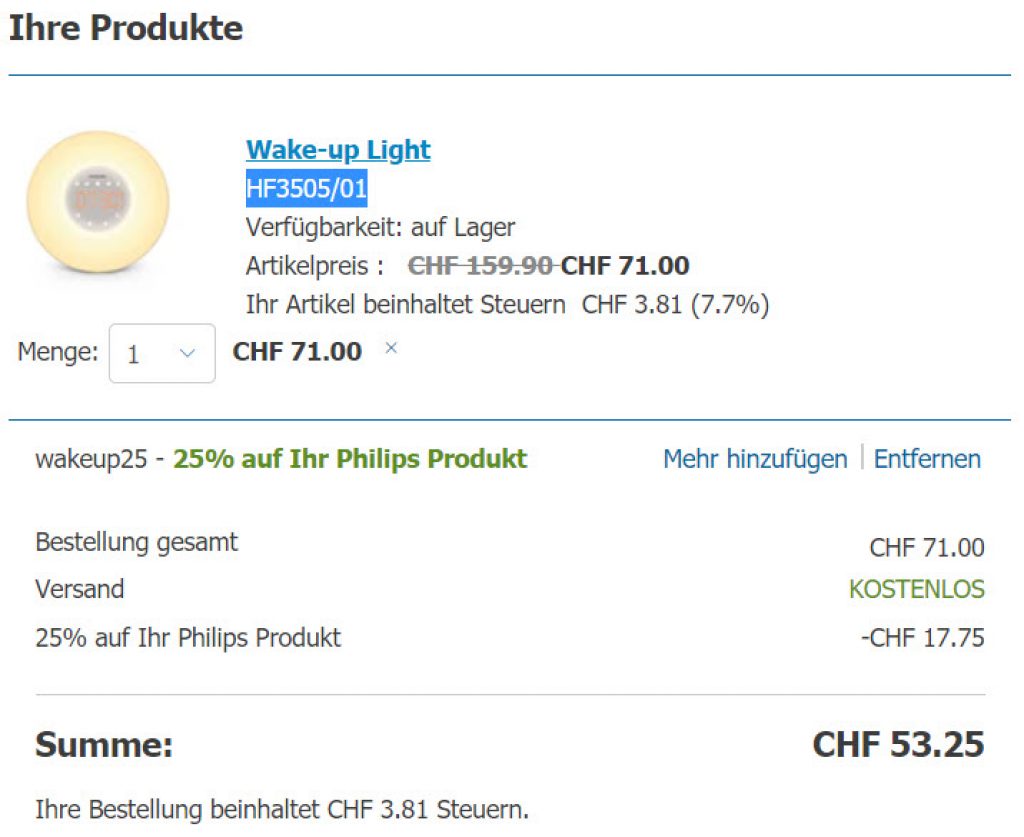 Wake-up Light HF3505/01 für CHF 53.25.-, der zweitbeste Preis ist bei CHF 70.- im Nettoshop.