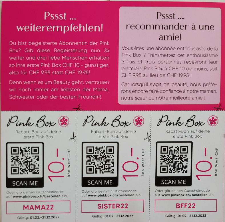 Ob dass gefällt, muss natürlich jeder selber wissen, aber hier wären Gutscheine für eine erste vergünstigte Pinkbox.