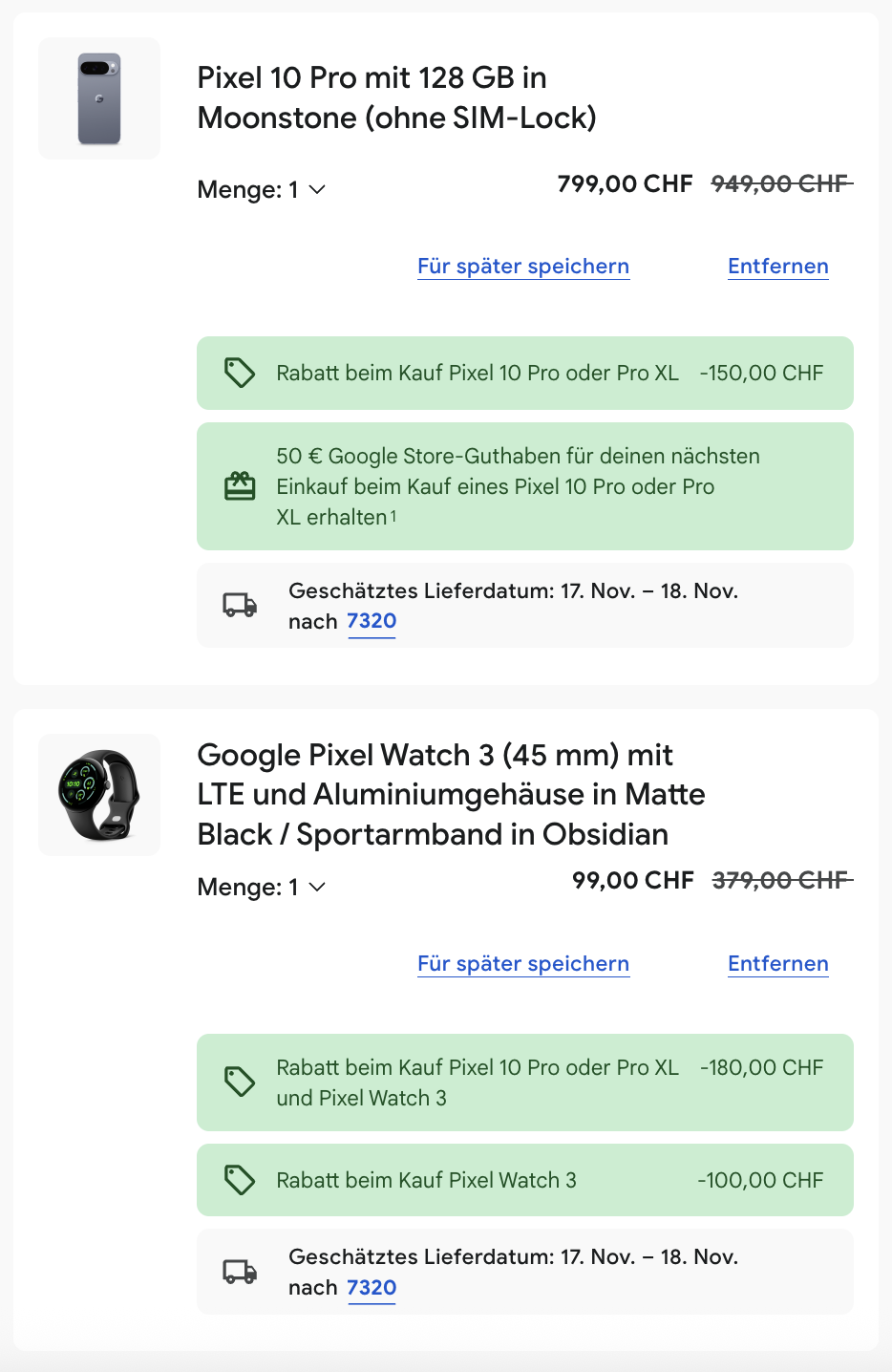 Im offiziellen Google Shop beim Kauf eines Pixel 10 Pro für 799 CHF (128 GB) oder 899 CHF (256 GB) können Sie eine Pixel Watch 3 LTE für 49 CHF (41 mm) oder 99 CHF (45 mm) hinzufügen und erhalten zusätzlich eine Geschenkkarte im Wert von 50 CHF.