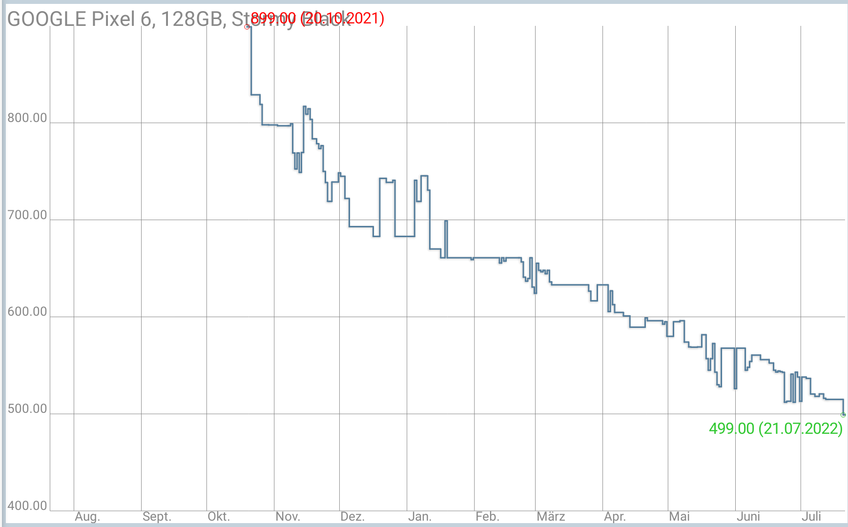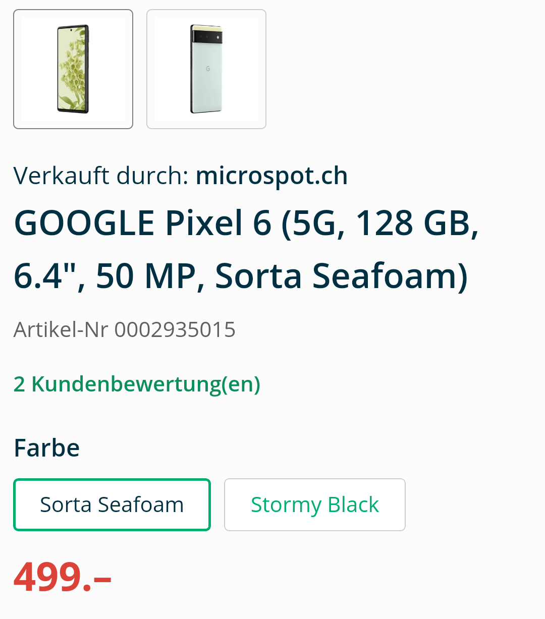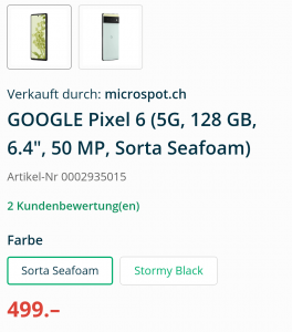Pixel 6 128 GB Sorta Seafoam und Stormy Black zum neuen Tiefstpreis. (Vermutlich weil das Pixel 6a heute rausgekommen ist. Deal dazu von Helder92 hier: https://www.preispirat.ch/pixel-6a-pixel-buds/ )