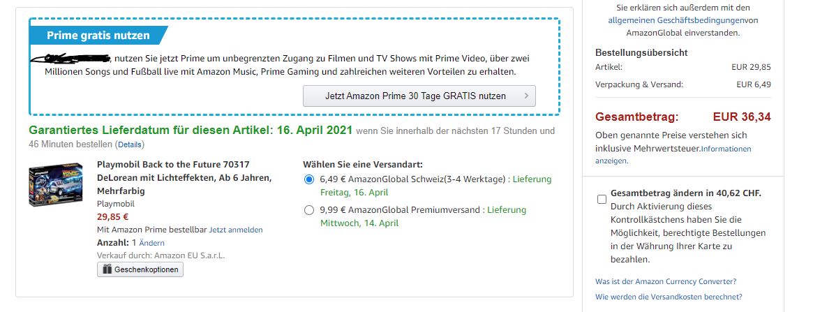- Für Lieferungen in die Schweiz wird der Preis erst bei Angabe einer Schweizer Lieferadresse richtig angezeigt (Abzug der Mehrwertsteuer, zuzüglich Versandkosten) resp. beim Checkout an der Kasse (Amazon Frankreich, Italien, Spanien und Grossbritannien). Wir verwenden grundsätzlich den Interbanken-Kurs für die Umrechnung in CHF.