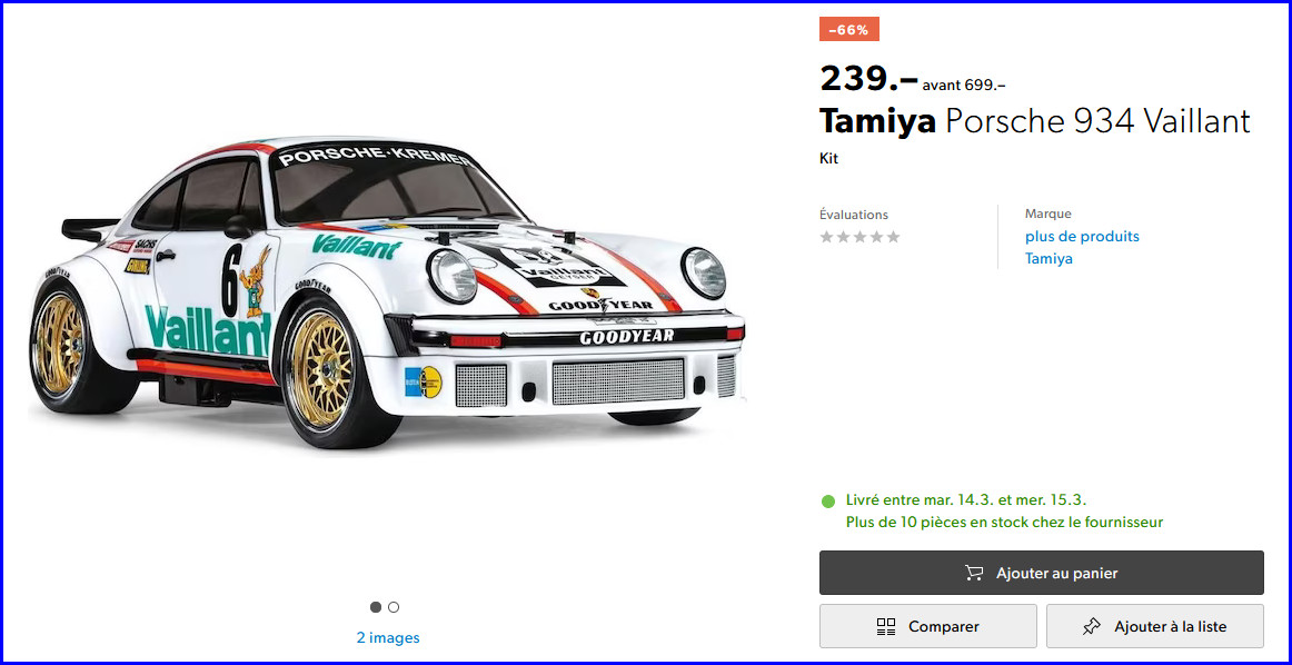Pour les passionnés de Porsche : TAMIYA Porsche 934 Vaillant TA-02SW, 4WD au prix de 239 Frs chez Galaxus/Digitec (lien).Prix habituel selon Toppreise : 698 Frs