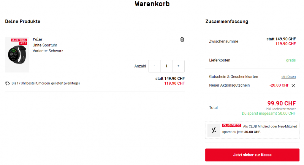 Zu meinem verwundern funktioniert der Ochnser Sport Newsletter Gutschein auch auf die Polar Unite Uhr und bringt somit den Preis auf CHF 99.90, was somit gleich der neue Bestpreis ist.