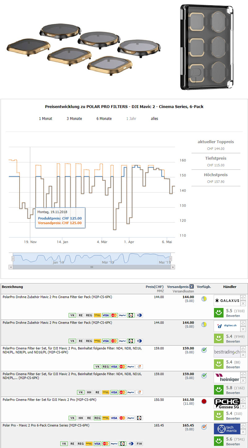 Bei Heiniger AG gibt es im heutigen Tagesdeal das PolarPro Cinema Filter 6er Set für die DJI Mavic 2 Pro zum Bestpreis von CHF 115.-.