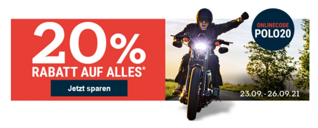 Bei POLO Moto gibts mit dem Gutscheincode POLO20 bis zum 26.09.2021 20% Rabatt aufs ganze Sortiment – ausgenommen sind Geschenkkarten, Bücher, Navis, Kommunikationsgeräte und Kameras.