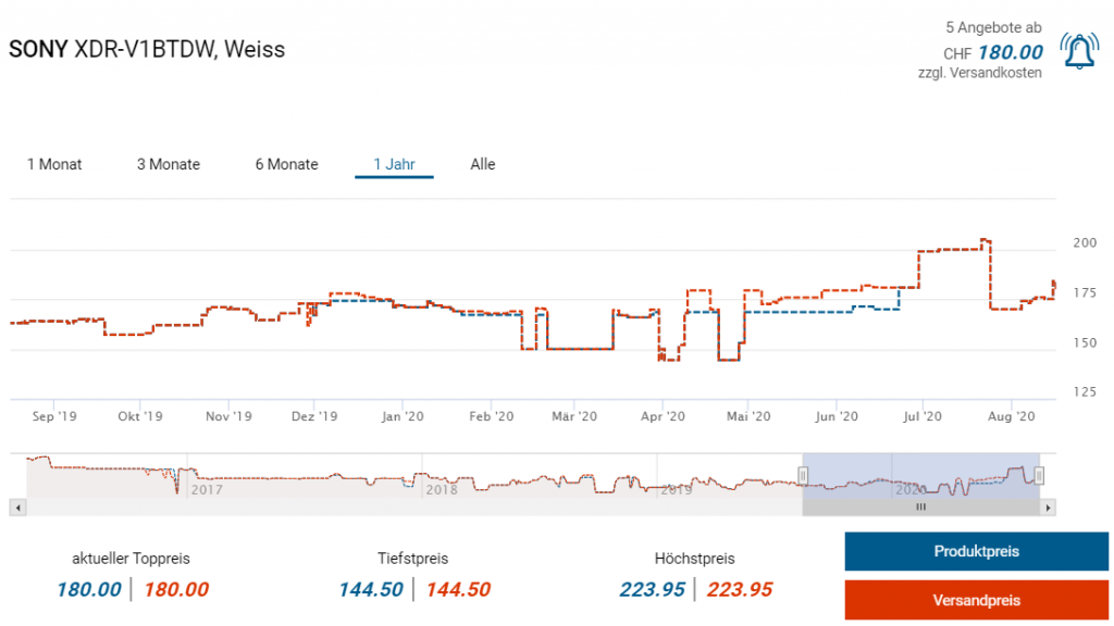 Bei Amazon gibts derzeit das mobile DAB+-Radio das im Kassensturz-Test von 2018 den 2. Platz belegte in Aktion für knapp 156 Franken. Laut toppreise solls das Gerät aber auch schon günstiger gegeben haben, den zweitbesten Preis gibts ab CHF 180.-