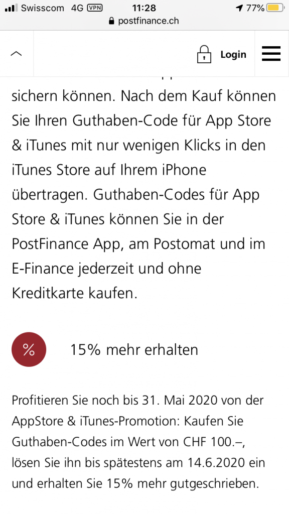 Jetzt 15% zusätzliches Guthaben auf App Store und iTunes-Guthaben CHF 100.-! Im E-Finance, mit der PostFinance App bzw. am Postomaten profitieren Sie bis zum 31.05.2020 unbeschränkt von diesem Angebot.
