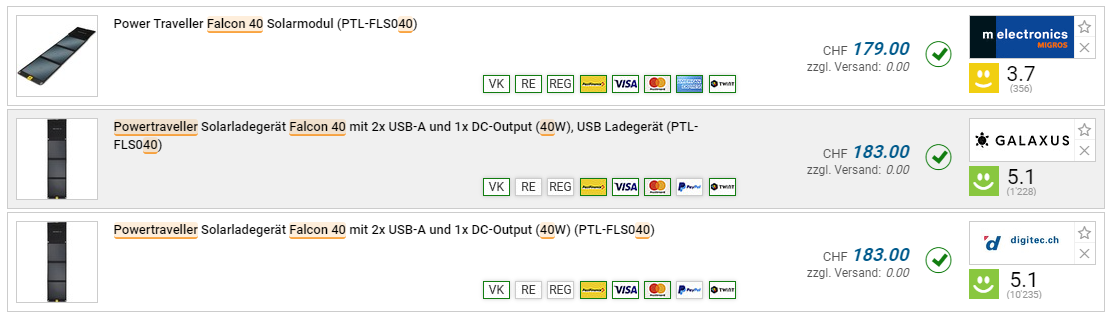 Bei digitec gibt es den Powertraveller Falcon 40 Solar charger für den Bestpreis von CHF 129.- im Tagesdeal. Ein Preisverlauf ist nicht vorhanden, der zweitbeste Preis liegt bei CHF 179.-.