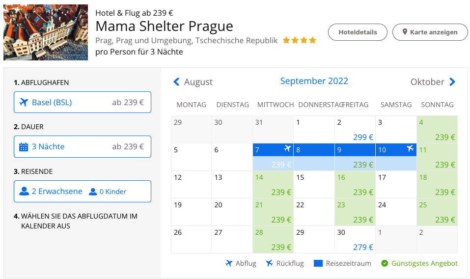 Für 239€ (ca. CHF 246) pro Person fliegt man von Basel nach Prag mit Easyjet und übernachtet drei Nächte im 4-Sterne Designhotel Mama Shelter Prague. Das Angebot ist für einige Sonntage im Juli und August sowie jeweils am Mittwoch, Freitag oder Sonntag im September und Oktober erhältlich.