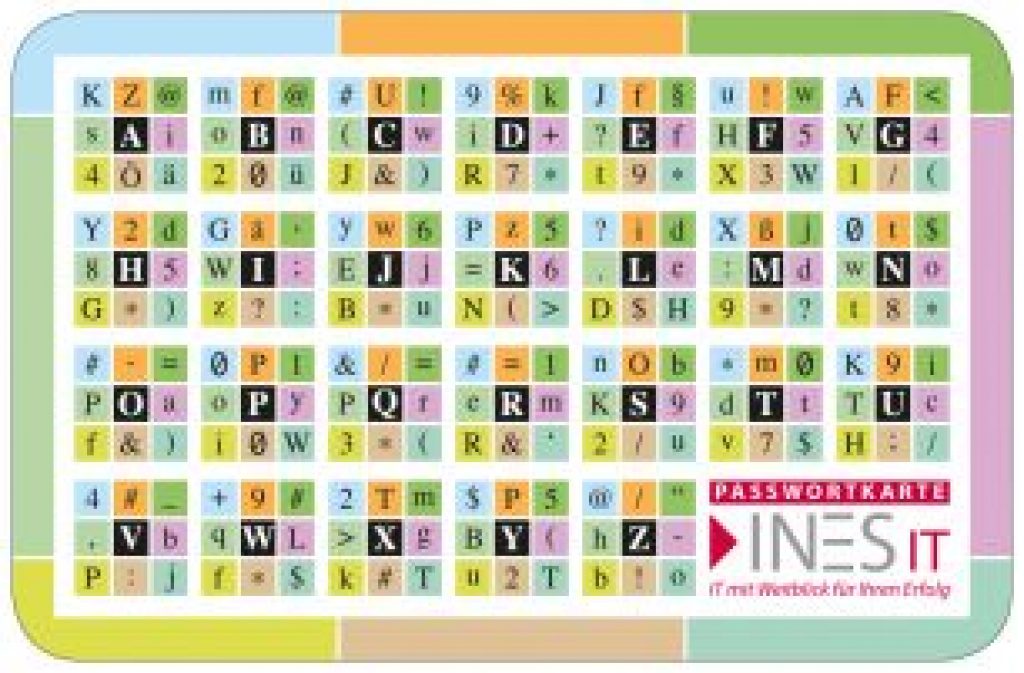 Diese Karte einmal ausgedruckt, ggf. laminiert und im Portmonee hinterlegt, kann auf viele Arten genutzt werden. Die ursprüngliche Idee ist, sich ein Wort aus den Buchstaben in der Mitte zu bilden und dann von einer festgelegten Position die Buchstaben, Zeichen und Ziffern darum herum zu nutzen. Es geht auch einfacher, indem einfach ein Kästchen, eine Zeile oder eine Spalte als Passwort genutzt wird.