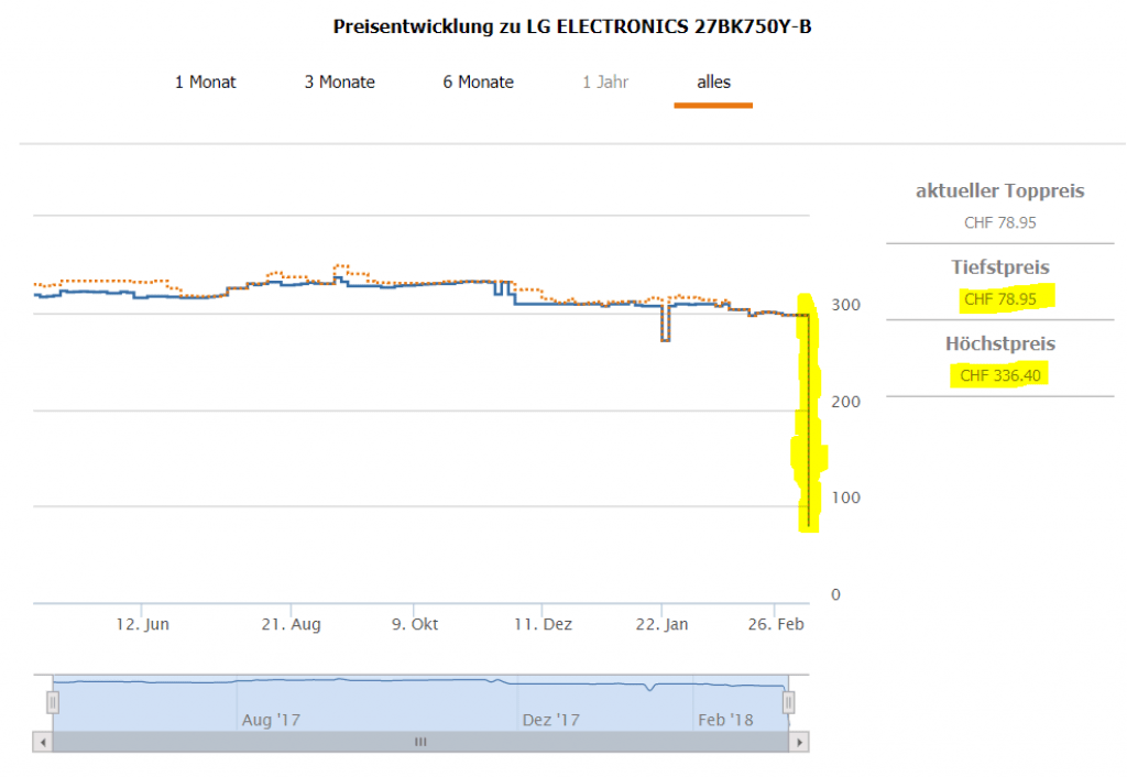 Nun haben sie es angepasst, der Preis ist wieder auf knapp 360 Franken und der Monitor in der richtigen Kategorie Monitore.