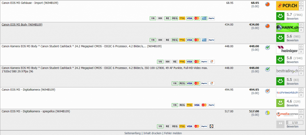Bei PCP gibt’s gerade einen Preisfehler. Den Body der Canon EOS M3 aus Import gibt’s für CHF 68.95. Zweitbester Preis: CHF 434.-