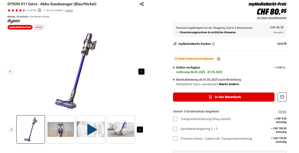 Bei MediaMarkt scheint es einen Preisfehler zu geben – seid schnell, ich denke, das wird rasch weg sein! Als Club-Mitglied könnt ihr den DYSON V11 (2. Generation) Extra nämlich für nur 80.95 Franken ergattern. Club-Mitglied zu werden geht ganz einfach: Einfach registrieren. Der Preis sollte dann im Warenkorb automatisch abgezogen werden.