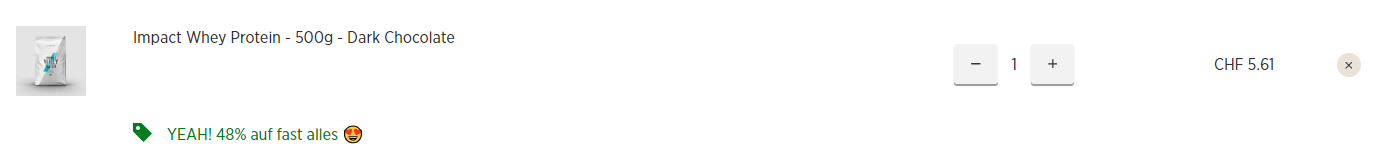Somit kommt man hochgerechnet, mit den üblichen Rabatten von MyProtein, auf 9.56 CHF im Warenkorb für 1Kg Whey Proteinpulver in guter Qualität – exklusive Versand.