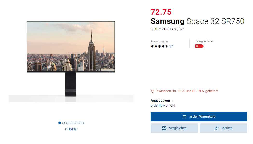 Schnell zuschlagen, bei digitec gibt’s gerade einen Preisfehler über den Marktplatz-Anbieter orderflow! Den 4K-Bildschirm Samsung Space 32 SR750 gibt’s für 72.75 Franken. Zugegeben ist die Helligkeit etwas tief, ansonsten ein Top-Deal (wenn’s nicht storniert wird…). Beachtet, dass es ein etwas älteres Modell ist.