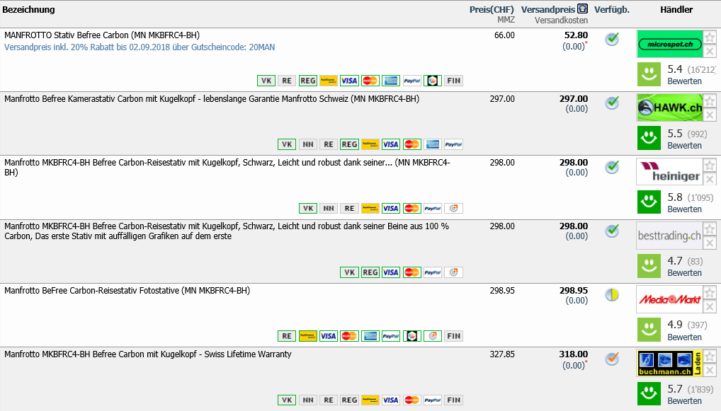 Nächster Preisfehler, bei microspot gibt es gerade das Stativ MANFROTTO BeFree in Schwarz für 66.- CHF.