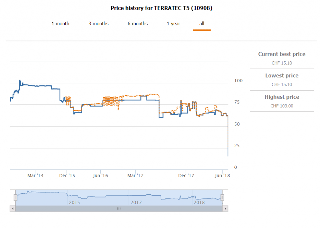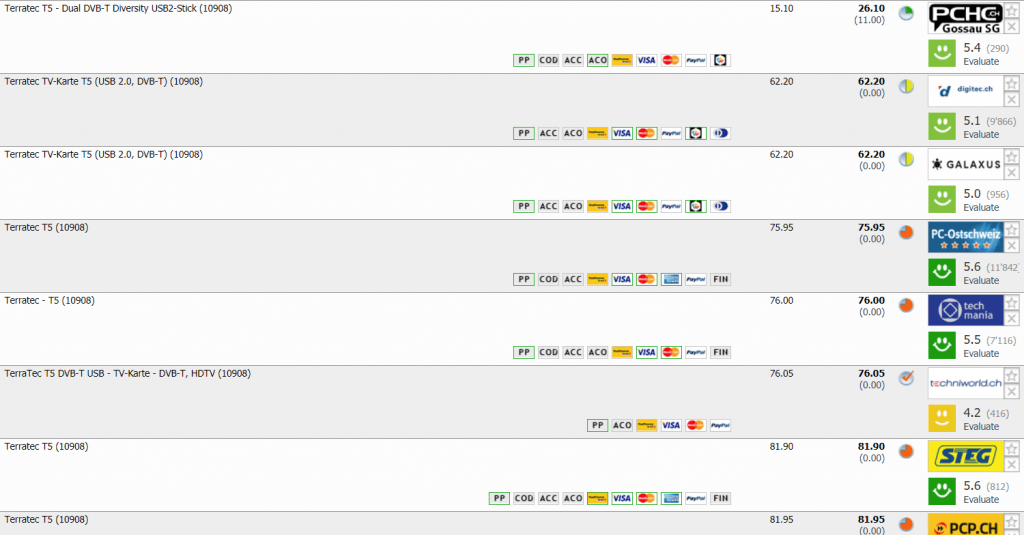 Beim PCHC Shop gibt’s gerade den Terratec T5 Dual DVB-T Stich für CHF 15.10, dazu kommt eine Versandpauschale von 11 Franken, macht total CHF 26.10. Der nächstbeste Preis liegt bei CHF 62.20 bei digitec. Unter 60 Franken erhielt man diese DVB-T Stick noch nie.