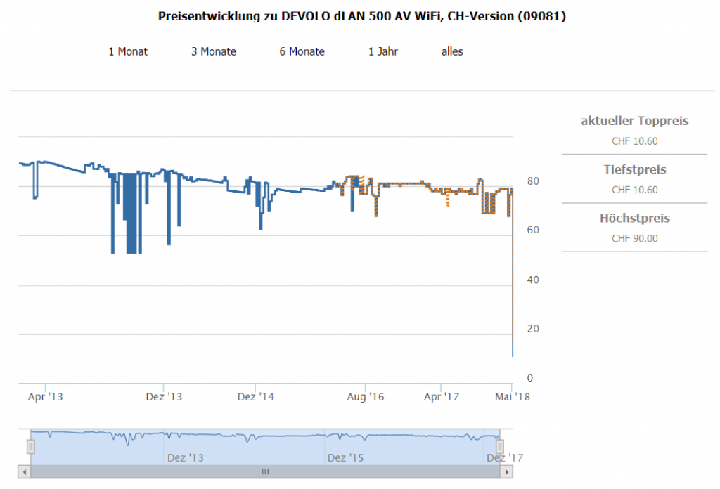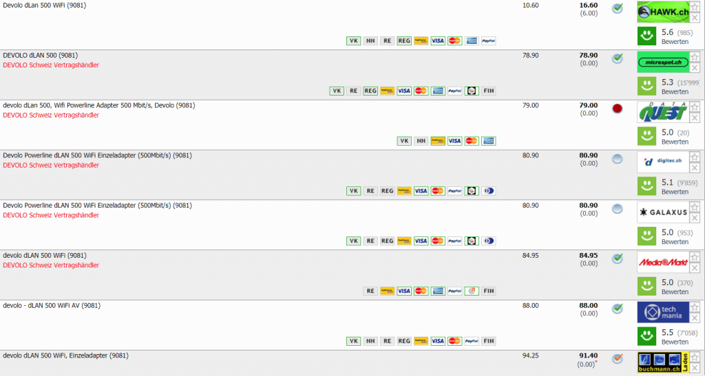 Der zweitbeste Preis für den WLAN Repeater Devolo dLan 500 liegt bei CHF 78.90 - bei hawk erhält man ihn bereits für CHF 10.60. Kauft man nur einen Repeater, kommen noch CHF 6.- Mindermengenzuschlag obendrauf. Bis zu welchem Betrag dieser Mindermengenzuschlag anfällt, steht leider nirgends.