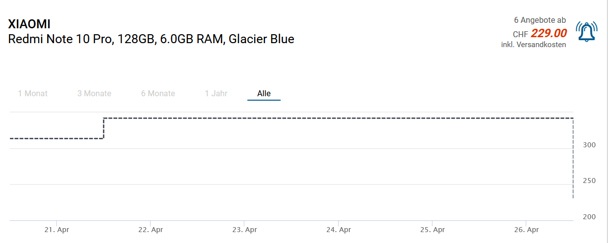 Bis gestern war das Redmi Note 10 Pro auf Digitec noch für 374 Fr. gelistet, jetzt hat es plötzlich einen extremen Preissturz erlebt. Wahrscheinlich ist es ein Fehler, denn 229 Fr. ist genau der Preis, den Digitec eigentlich für das “schlechtere” Modell (Redmi Note 10, ohne Pro) verlangt. Ausserdem steht bei der Verfügbarkeit “Vorbestellung ohne bestätigten Liefertermin“. Da man das Handy aber ganz normal in den Warenkorb legen und bestellen kann, ist es bestimmt einen Versuch wert😀 Wenn’s dann storniert werden sollte, dann hat man’s wenigstens probiert😁