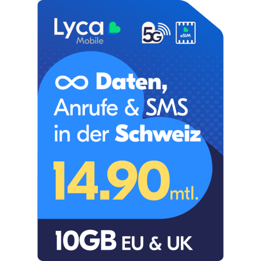 Zahlst du zu viel für dein Abo? Mit diesem Angebot von Lyca Mobile sicherst du dir starke Salt-Netzqualität mit allem unlimitiert in der Schweiz sowie 10GB in EU & UK für dauerhaft CHF 14.90 pro Monat + gratis Aktivierung!
