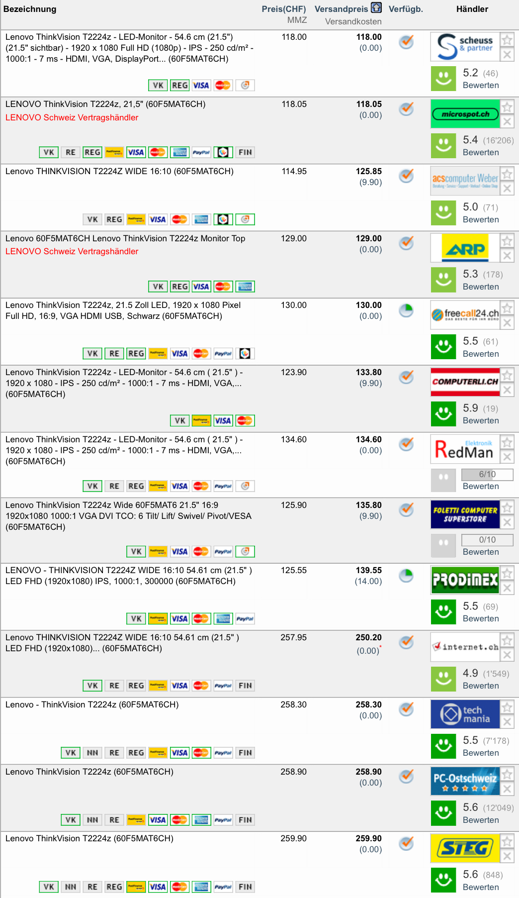 Bis gestern gab es den 21.5″ Monitor LENOVO ThinkVision T2224z nie günstiger als für 195.- CHF.